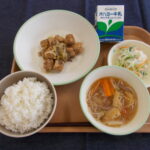 9月24日 / 最終更新日時 : 9月24日 okamo10 今日の給食 2025年9月24日(水)の給食 ごはん 牛乳 かつおのから揚げねぎレモン味 春雨サラダ 豚汁(757キロカロリー) カラリと揚げたかつおにレモン果汁入りのさっぱり味のたれをからめました。魚のクセが抑えられて食べ易くなっています。