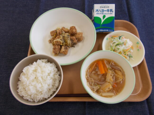 9月24日 / 最終更新日時 : 9月24日 okamo10 今日の給食 2025年9月24日(水)の給食 ごはん 牛乳 かつおのから揚げねぎレモン味 春雨サラダ 豚汁(757キロカロリー) カラリと揚げたかつおにレモン果汁入りのさっぱり味のたれをからめました。魚のクセが抑えられて食べ易くなっています。
