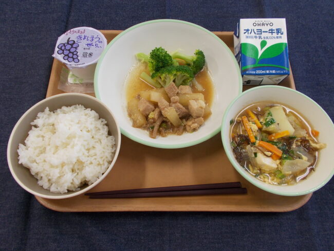 ごはん 牛乳 豚肉のごまソース もずくスープ ぶどうゼリー(738キロカロリー)