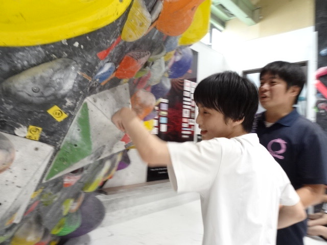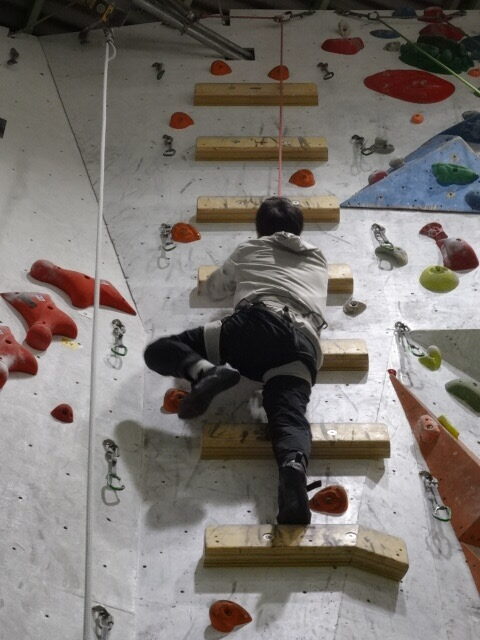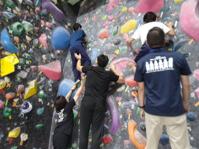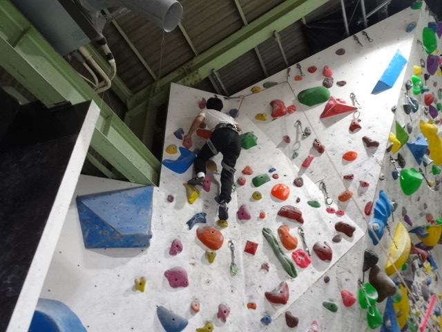 視覚障害があってもできる生涯スポーツの取り組みとして、また、新しいことにも前向きにチャレンジする気持ちを育むことを目標として、ボルダリング(クライミング)に取り組みました。スクールバスに乗って倉敷のロックスクライミングジムに移動し、ロックス代表の柳瀬さんと、本校卒業生の福原さんに、ボルダリングとクライミングについて教えていただきました。ほとんどの生徒が初めての体験でしたが、ホールドを触ったり、ボルダリングで慣らしたりしながら、個々の目標に合わせてチャレンジしました。ハーネスをつけて10m以上あるゴールまでのぼったり、クロックポジションの指示を聞いてホールドをつかんだり、笑顔でホールドを触ったり、全員が意欲的に、そして楽しく活動しました。クライミングでは、けっこうな高さにもかかわらず怖がらずにどんどんのぼっていくのでビックリしました。今回の体験を生かして、何事にも前向きにチャレンジしたり、ボルダリングを余暇活動のひとつとして続けたりしてくれたらいいなと思います。