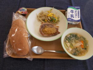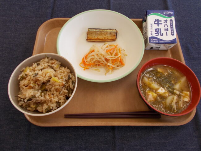 ねぶかめし 牛乳 さんまの塩焼き もやしのあえもの のりのみそ汁(704キロカロリー)