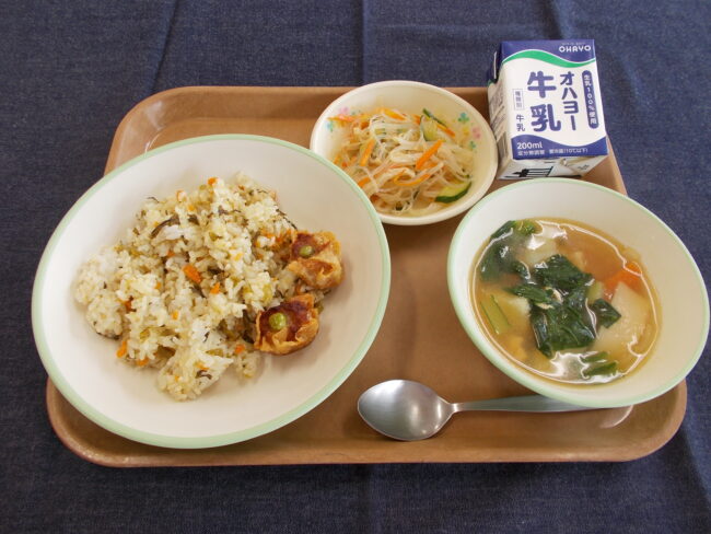 高菜チャーハン 牛乳 ばんさんすう ワンタンスープ 揚げしゅうまい(709キロカロリー)