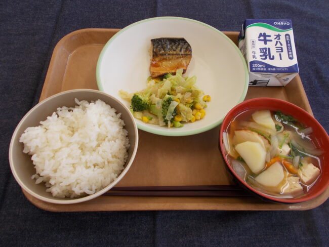 ごはん 牛乳 さばの塩焼き キャベツとコーンのごまみそあえ とうふのすまし汁(683キロカロリー)