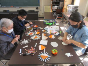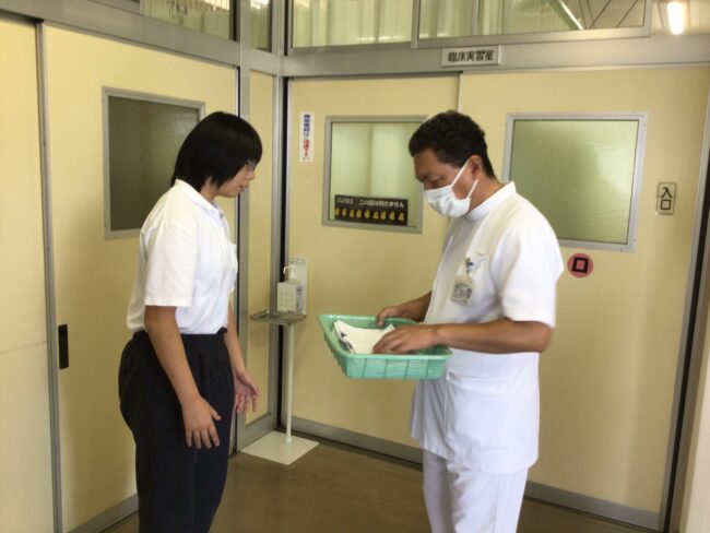 その後、実際に手ぬぐいを使ってマッサージをしている様子を見学させてもらいました。私が縫った手ぬぐいを、患者さんの腕にかけてマッサージをしていました。『こんなふうにマッサージをしているんだ』と思いました。学習したことが、誰かの役に立っていて、また頑張ろうと思いました。(生徒記者)