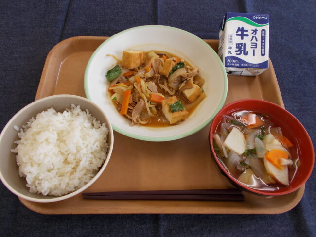 ごはん 牛乳 厚揚げのみそいため かまぼことねぎのすまし汁(659キロカロリー)