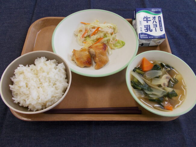 ごはん 牛乳 若どりのマーマレード焼き れんこんサラダ 野菜のスープ煮(728キロカロリー)