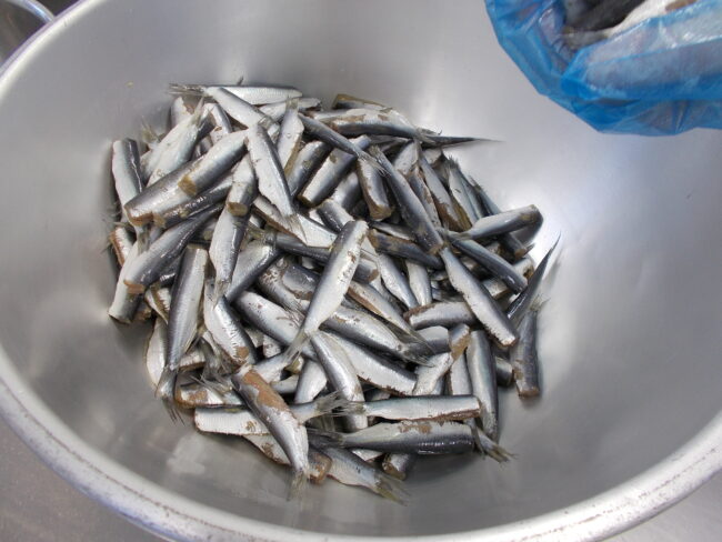 ままかりは広くは「サッパ」と呼ばれ、岡山ではこの魚がおいしくてごはんがすすみ、まま(ごはん)を隣の家に借りに行くほどだというところから、ままかりと呼ばれています。今日のものは瀬戸内海産でした。頭を落とした魚にかたくり粉をまぶして油で揚げ、三杯酢で味をつけました。サイズは小さかったのですが、しっかりごはんがすすんだようでした。