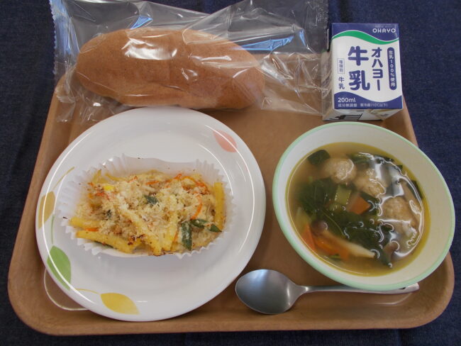 胚芽パン 牛乳 おからグラタン ミートボールとトマトのカレースープ(739キロカロリー)