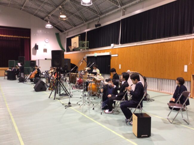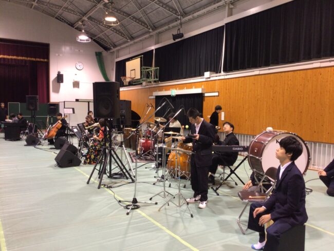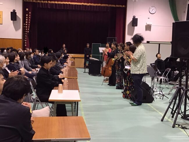 そして、ピアノ、チェロ、バイオリン、トランペット、サックス、パーカッションで、たくさんの曲を披露してくださいました。生徒からのリクエスト「赤いスイトピー」「2億4千万の瞳」も届けてくださり、会場はおおいに盛り上がりました。1番の盛り上がりを見せたのは、本校の児童生徒とのコラボ演奏です。藤井風の「きらり」、B’zの「兵、走る」の演奏、最後は小鳩文化事業団の演奏に合わせて、全員で校歌を歌いました。プロの演奏家と本校の児童生徒のコラボは見応え聴き応えが存分にあり、心が震わされるものでした。子どもたちが心から楽しそうに担当の楽器を演奏し、それがプロの演奏の音色と重なり、さらに楽しさに磨きがかかり、子どもたちが心から満足している様子が私たちの心に響きました。