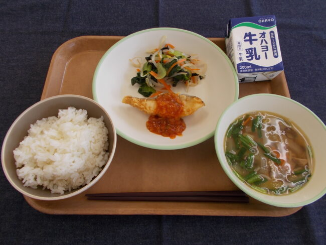 ごはん 牛乳 白身魚のチリソース 華風あえ 春雨スープ(703キロカロリー)