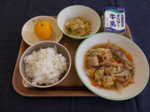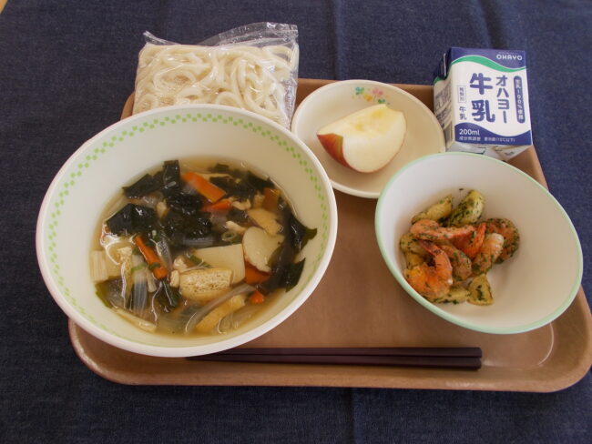 わかめうどん 牛乳 えびとじゃがいもの磯あえ りんご(708キロカロリー)