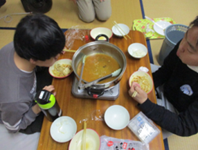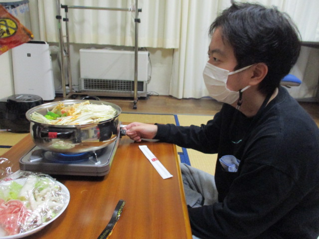 青雲寮1階2室の舎生と指導員の親睦を図りつつ、鍋会を開催しました。準備は、下校後から空き時間を使いながら舎生2人で行いました。青雲寮と本館を行き来しながら準備をしました。準備を終え、2室で鍋を温め始めると、キムチのいい匂いと舎生の楽しそうな笑い声が部屋から溢れ出ていました。準備した材料は残すことなく4人でしっかり完食しました。