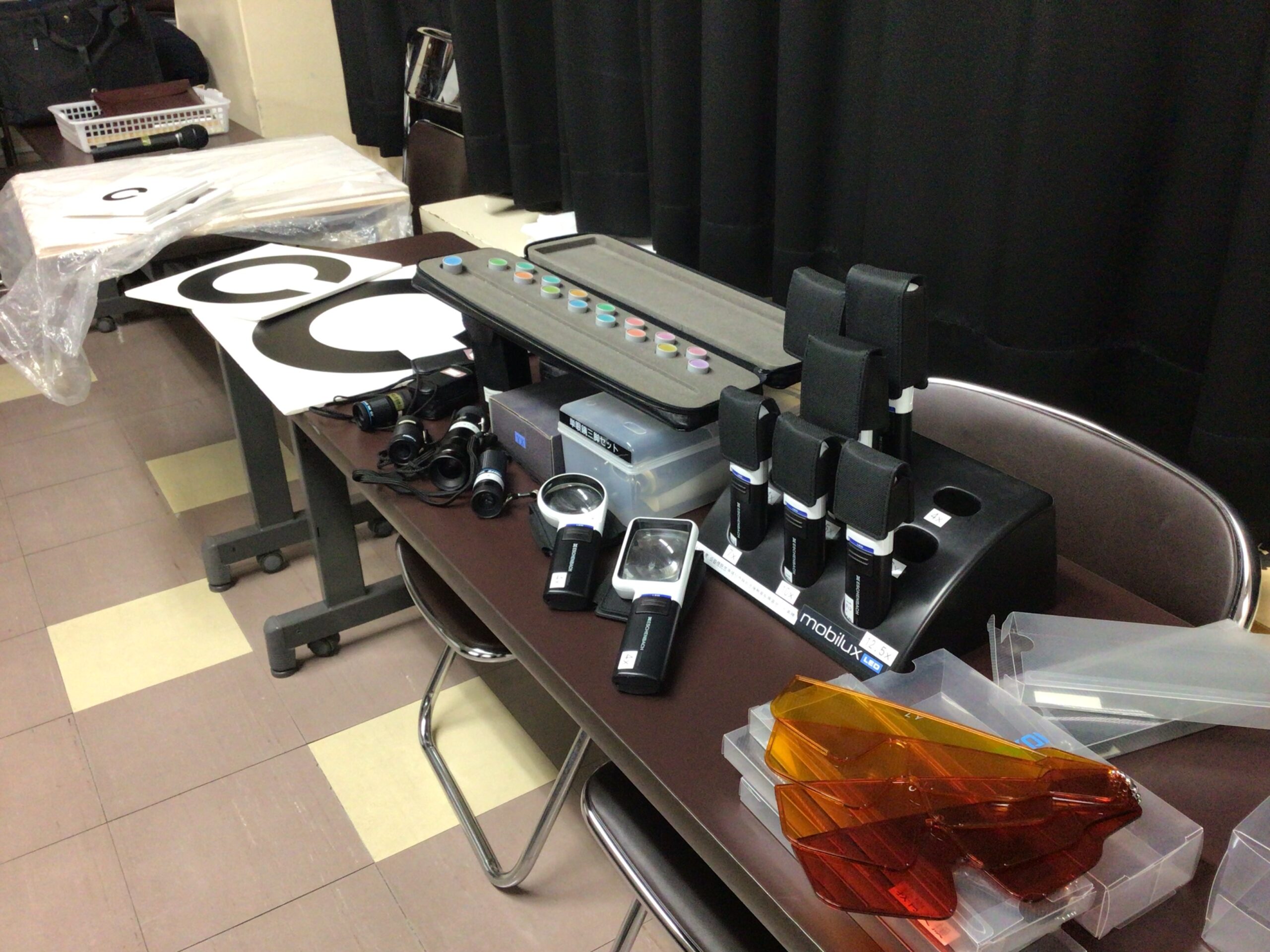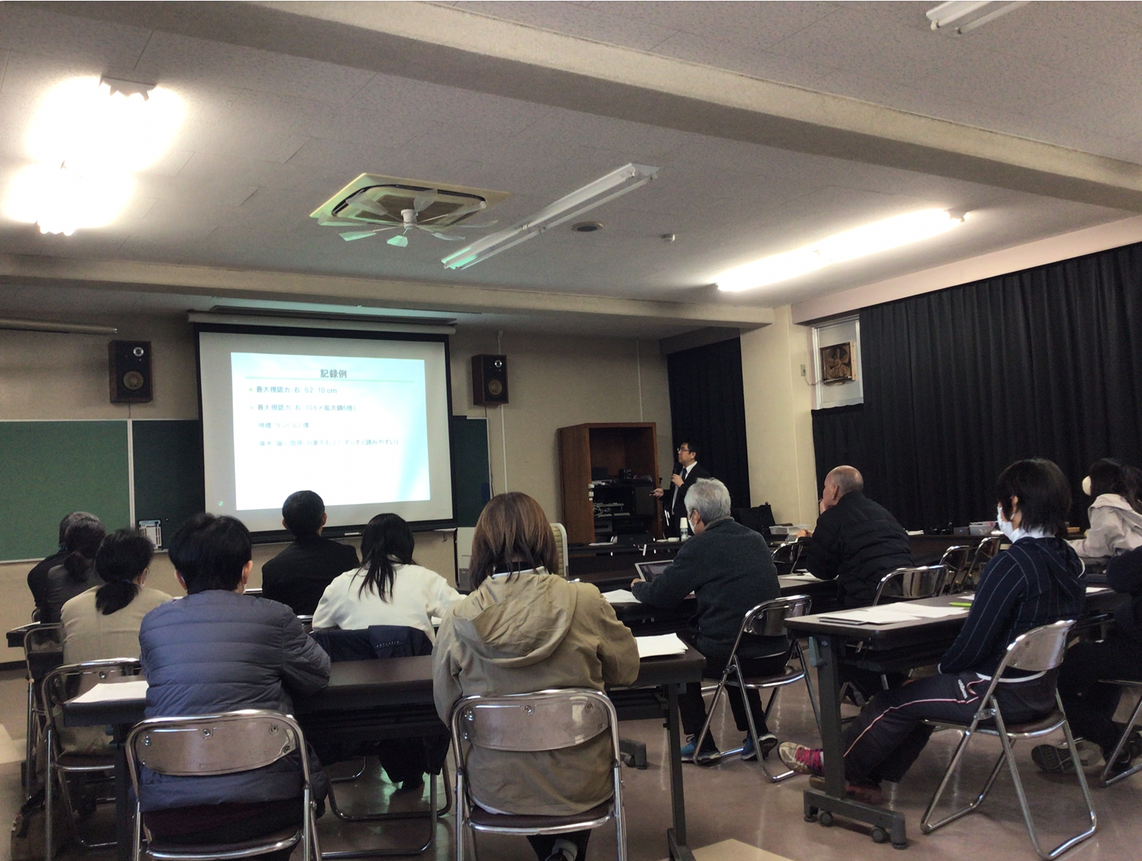 本校では、毎年、川崎福祉大学視能療法学科の米田剛先生をお招きして研修を受け、専門性の維持、向上に役立てています。今回は「視機能検査と視覚補助具の活用について」講義をしていただきました。視機能検査の細かな配慮点や注意点、ルーペや単眼鏡、遮光眼鏡の選定する際のポイントなど、多くのことを教えていただきました。こうした貴重な研修の機会を大事に、研鑽していきたいと思います。