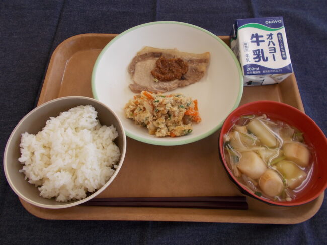 ごはん 牛乳 豚肉のみそだれかけ 卯の花いり すまし汁(690キロカロリー)