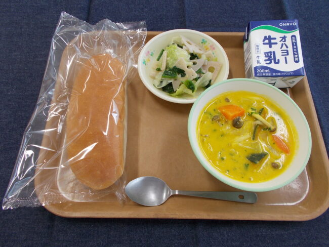 米粉パン 牛乳 かぼちゃのクリームシチュー ほうれん草とれんこんサラダ(677キロカロリー)