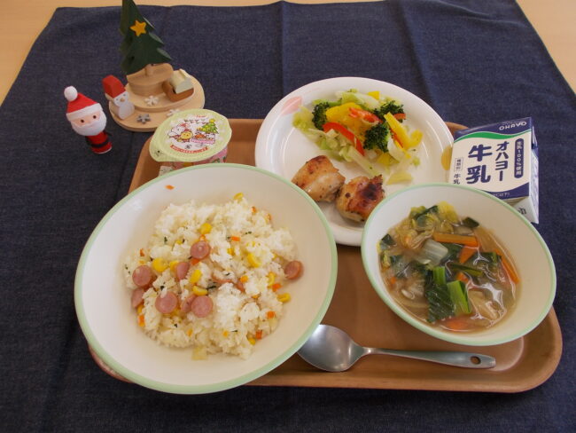 コーンピラフ 牛乳 バジルみそチキン パプリカのサラダ 白菜スープ いちごプリン(731キロカロリー)