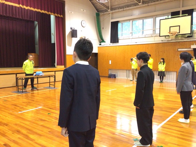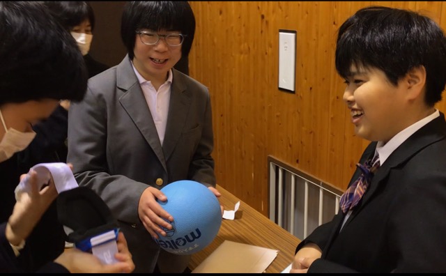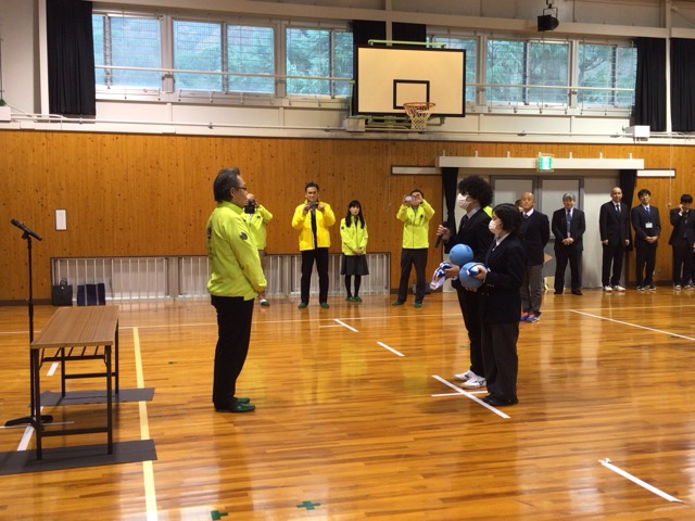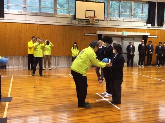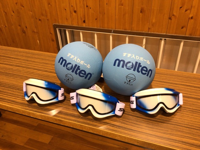 岡山あげはライオンズクラブ様より、鈴入りボールとアイシェードをいただきました。鈴入りボールは体育館や学活で、アイシェードは部活動でも使います。代表生徒が受け取り、「来年度の中国四国地区盲学校体育大会で全国を目指します」と、お礼の言葉を述べました。