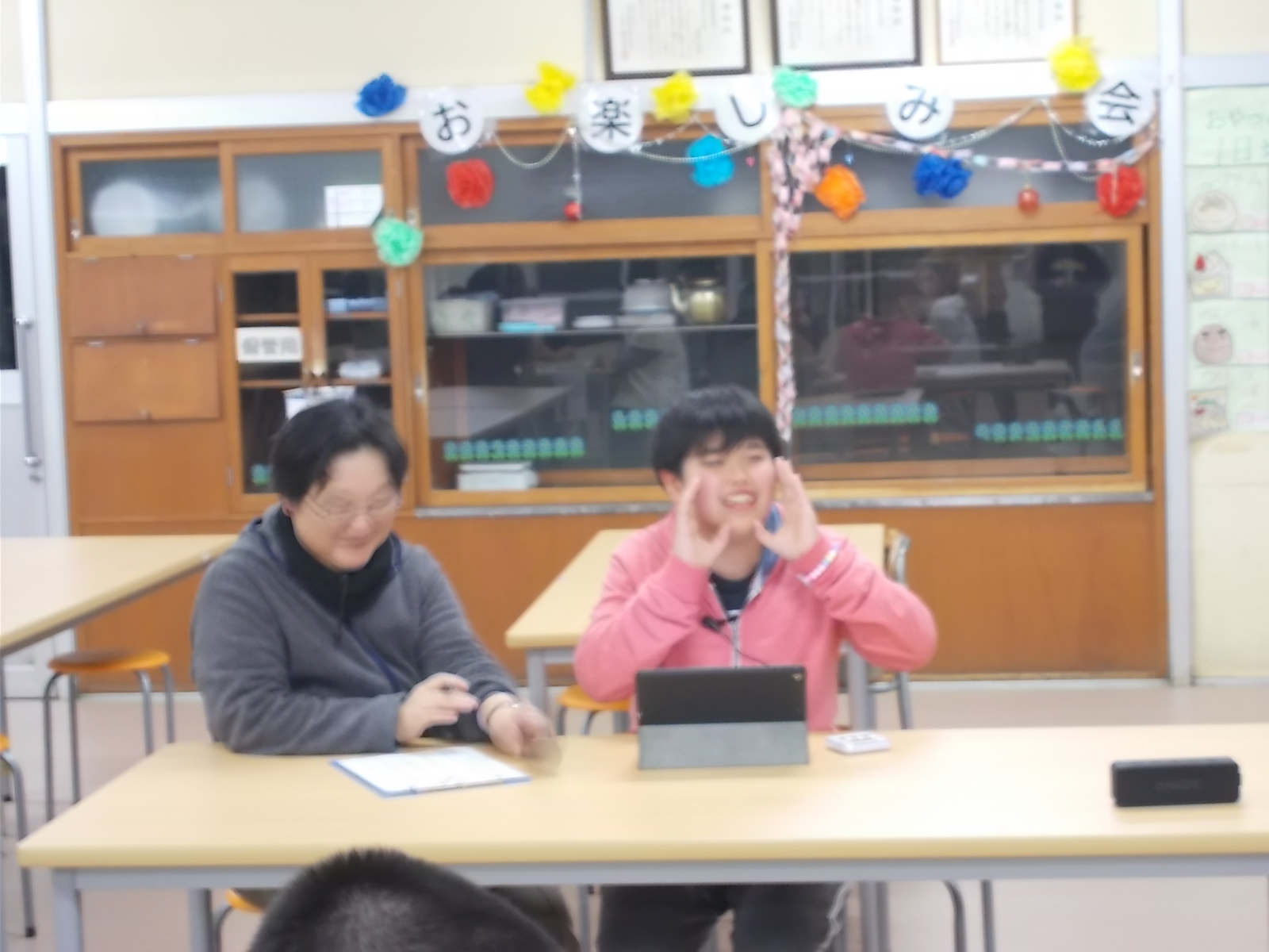 12月16日(火)の夕食後に食堂で「お楽しみ会」が行われました。実行委員の舎生が出し物を考え、「以心伝心」ゲームや「うまい棒味当てクイズ」を行い、とても盛り上がってみんな楽しんでいました。その後、それぞれリクエストしたケーキとジュースをみんなで食べています。