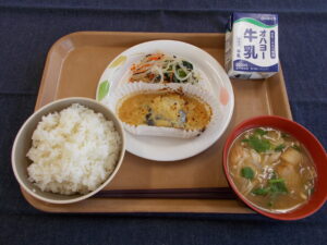 今日の献立は中学部の生徒が家庭科授業で考えた献立です。授業では「成長期に必要な栄養と食事」を学習しました。成長期に必要な栄養素と働きは何か、一日にどのような食品をどのくらい食べたらよいかを6つの基礎食品群に分けて学習し、昼食分として考えた献立を給食で実施しました。その仕上げとして今日は、給食時に栄養素のこと、献立の工夫について発表をしてくれました。 今日は食べ残しも少なかったですよ、大成功!ぜひ、外食やお弁当を選んだりする時にもこの学習を活かしてほしいと思います。