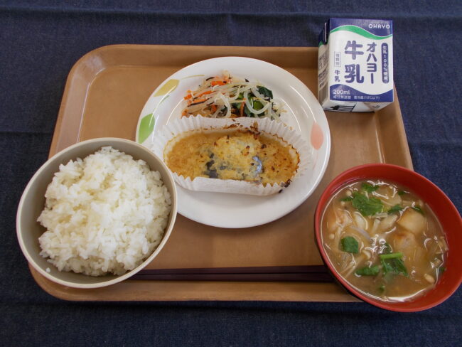 そして、みそ汁には高等部普通科生の育てただいこんを使用しました。水曜日、育てた3名の生徒が食堂に持ってきてくれました。「少し虫にやられていますが、頑張って育てました」「一生懸命抜いて、きれいに洗いました」とっても新鮮でしたので、葉も使用しました。給食時に紹介をすると、拍手が湧きました。みんな感謝をしていただきました。美味しかったですよ!
