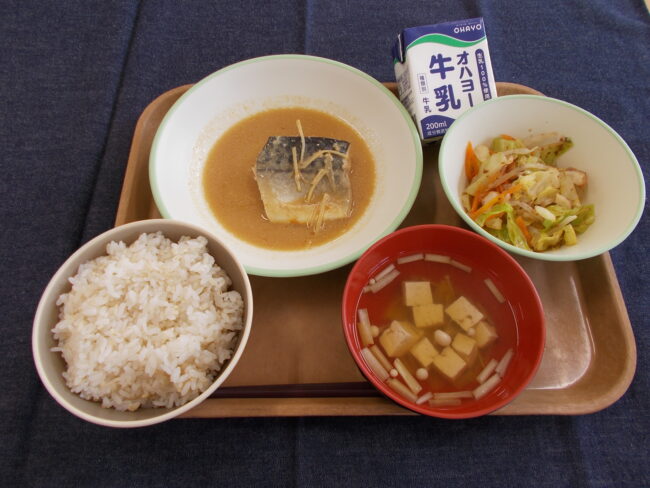 麦ごはん 牛乳 さばのみそ煮 梅おかかあえ 黄ニラのすまし汁(676キロカロリー)