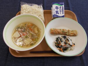 今月は豆に注目した献立にしていますが、今日はしっかり使っています。卯の花いりにはおからと油揚げ、みそ汁にはとうふと豆乳、みそを使いました。それぞれのつながりについてみんなわかったかしら?
