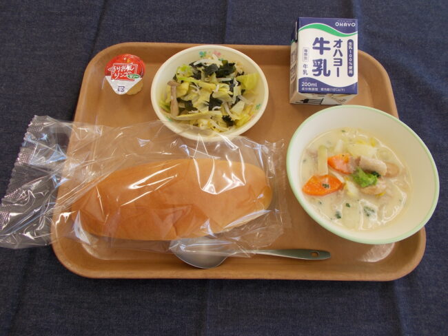 米粉パン 牛乳 豆と白菜のシチュー わかめサラダ ミニゼリー(652キロカロリー)