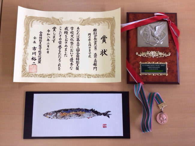 先日、全国特別支援学校文化連盟が主催する第32回全国特別支援学校文化祭が行われました。選考会では、本校普通科2年生が美術の時間につくった作品(さんまのちぎり絵)が造形美術部門で選ばれ、岡山県の代表作品として出品されました。そこで見事、全国盲学校長賞を授賞し、賞状、盾、メダルをいただきました。