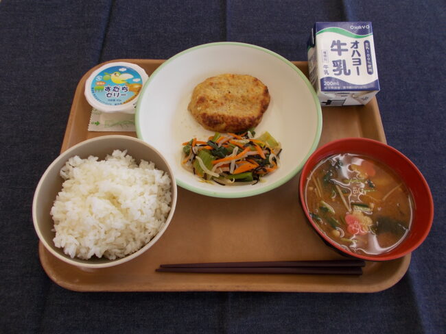 ごはん 牛乳 とうふ入りハンバーグ ひじきの五目あえ 梅麩のみそ汁 すだちゼリー(708キロカロリー)