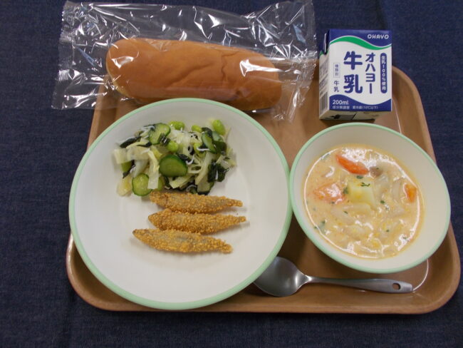 米粉パン 牛乳 キャロットシチュー きびなごのカリカリフライ わかめサラダ(742キロカロリー)