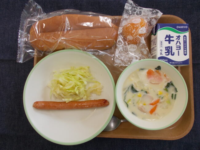 4月23日 / 最終更新日時 : 4月23日 okamo10 00岡盲の今日 2026年4月22日(水)の給食 ウインナーサンド 牛乳 野菜ポタージュ 冷凍ピーチ(723キロカロリー) 四月も半ばを過ぎ、日中は暑いと感じる日も出てきました。そろそろ冷たいフルーツがおいしく感じるようになりますね。